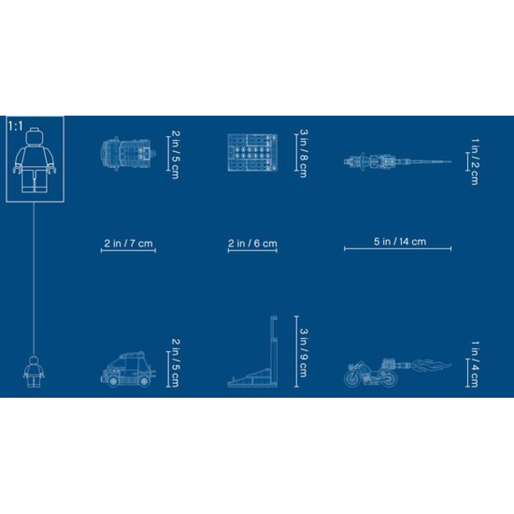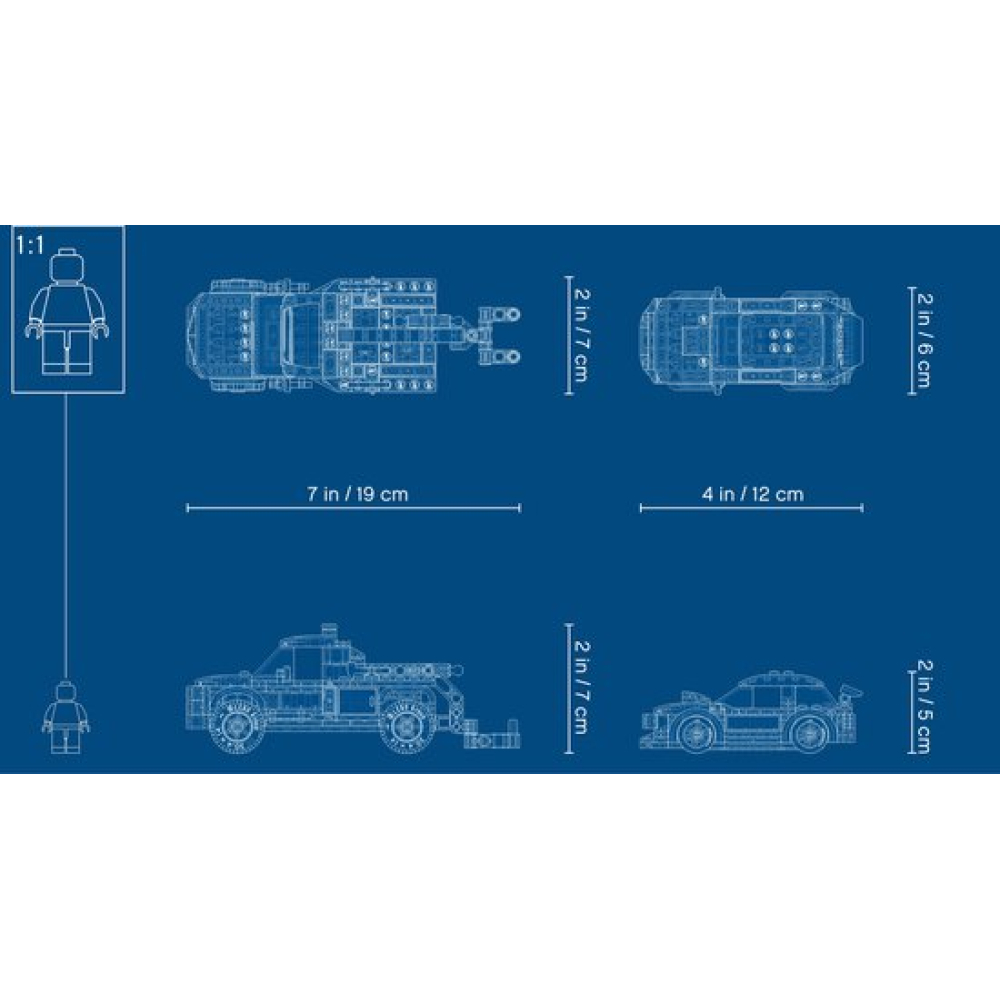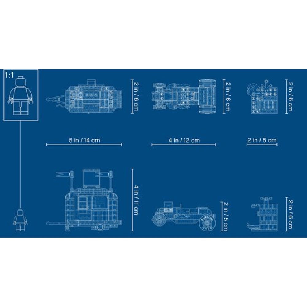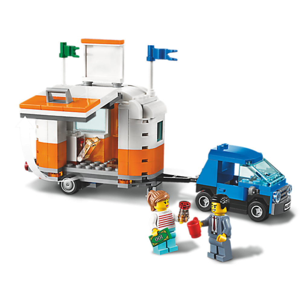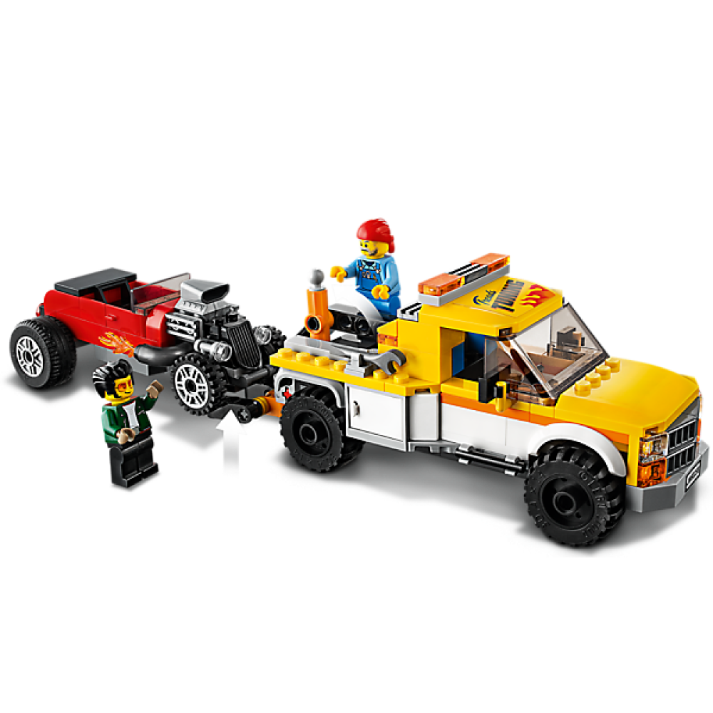 De set bevat een werkplaats, een caravan, een sleepwagen, een coole rode raketmotor en 7 grappige – leuke minifiguren.