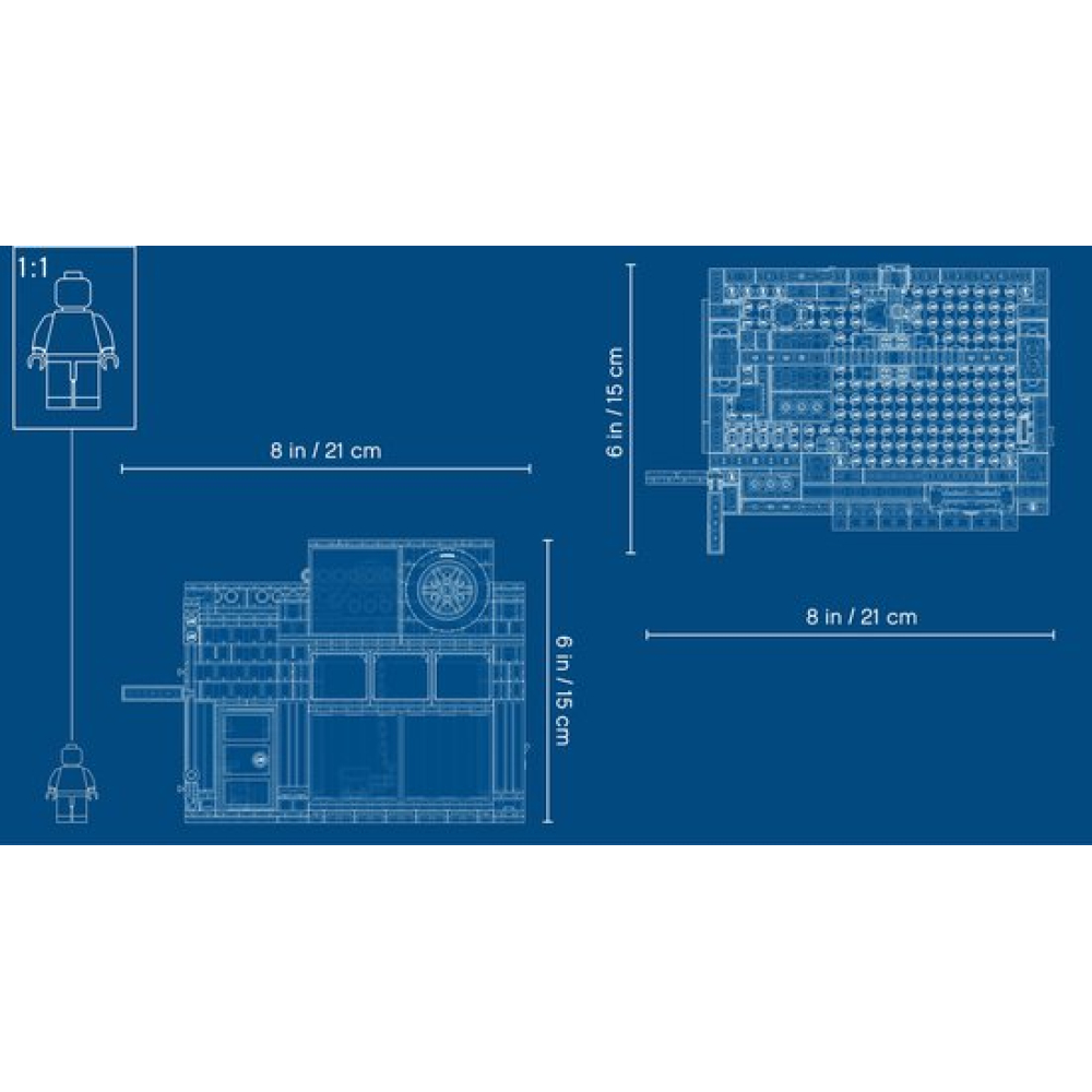 De werkplaats van meneer Tread Octane is 14 cm hoog, 17 cm breed en 13 cm diep.