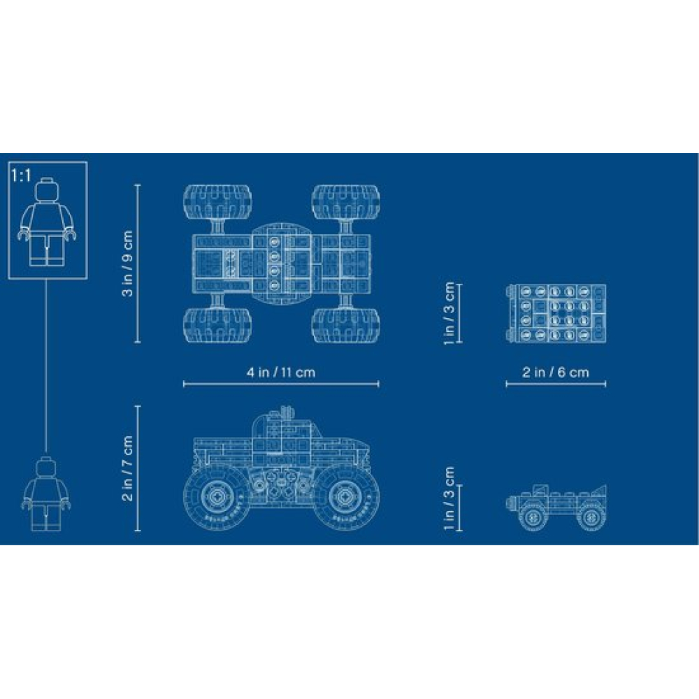 De monster truck heeft een afmeting van 6 cm hoog, 10 cm lang en 8 cm breed.