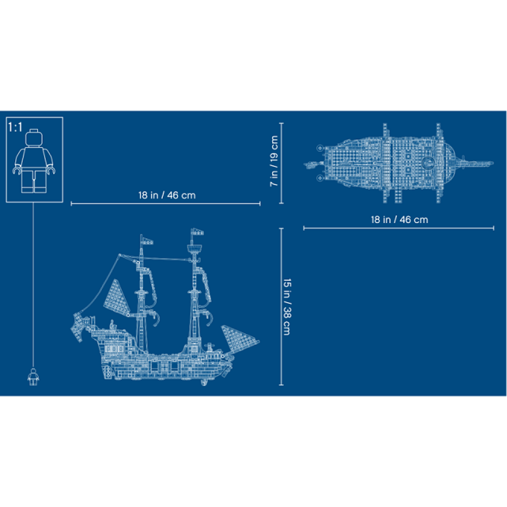Het piratenschip is 37 cm hoog, 46 cm lang en 19 cm breed.