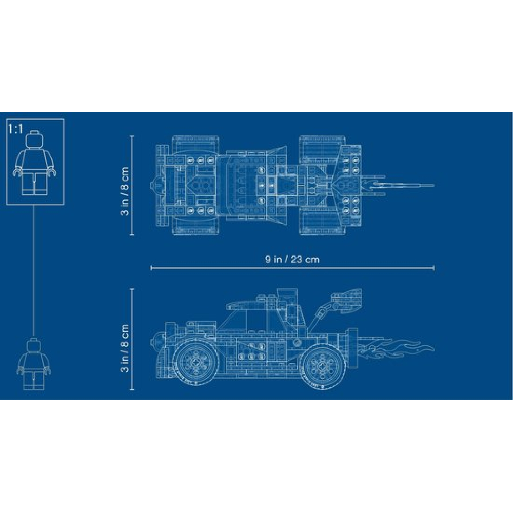 De raketwagen is 8 cm hoog, 22 cm lang en 7 cm breed.
